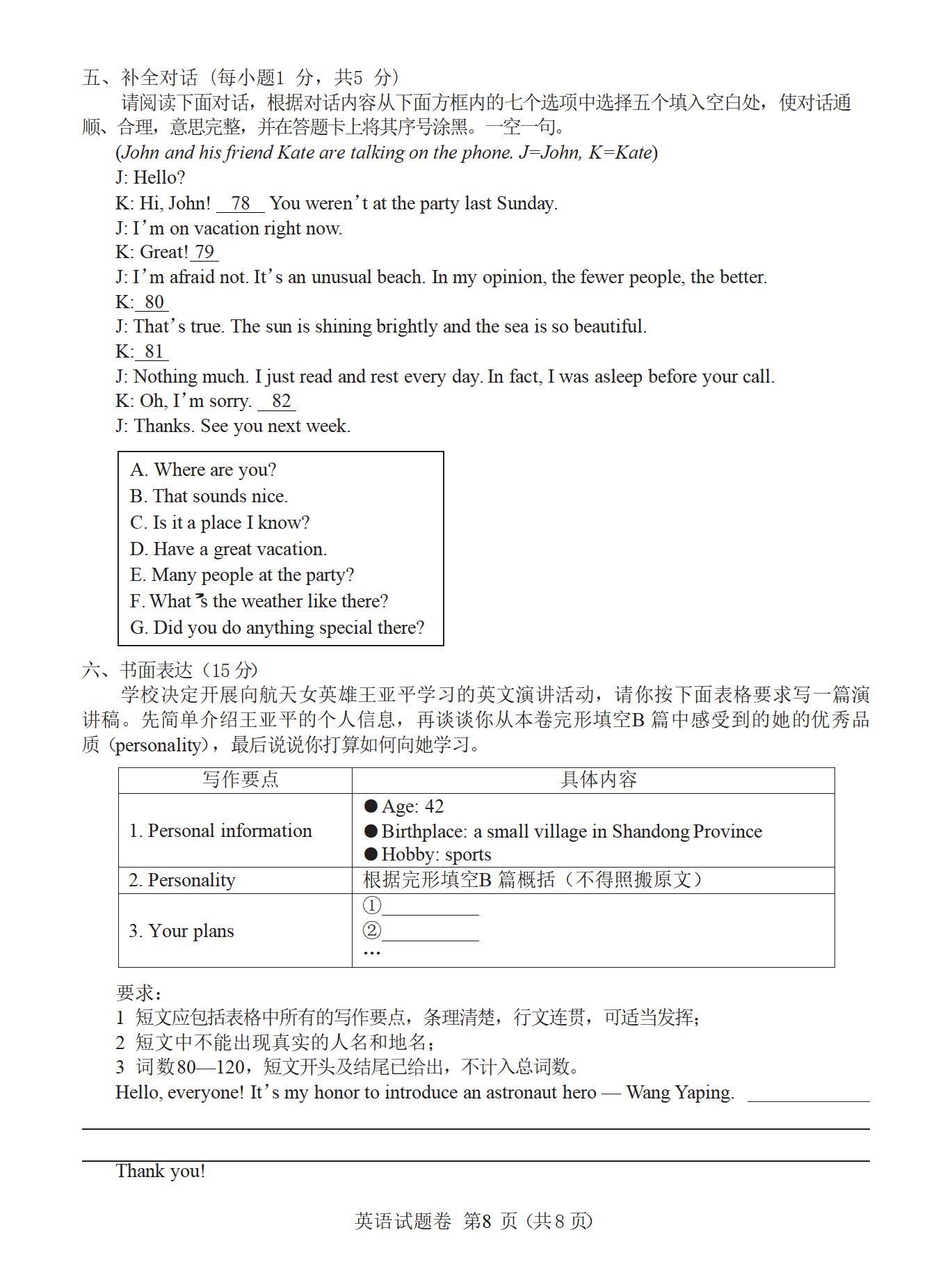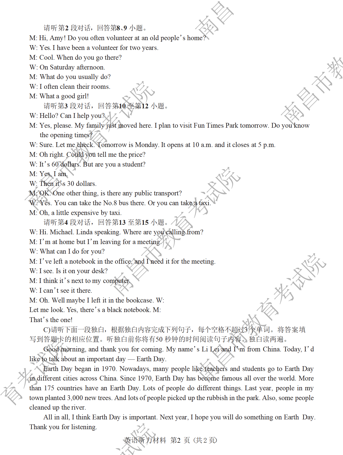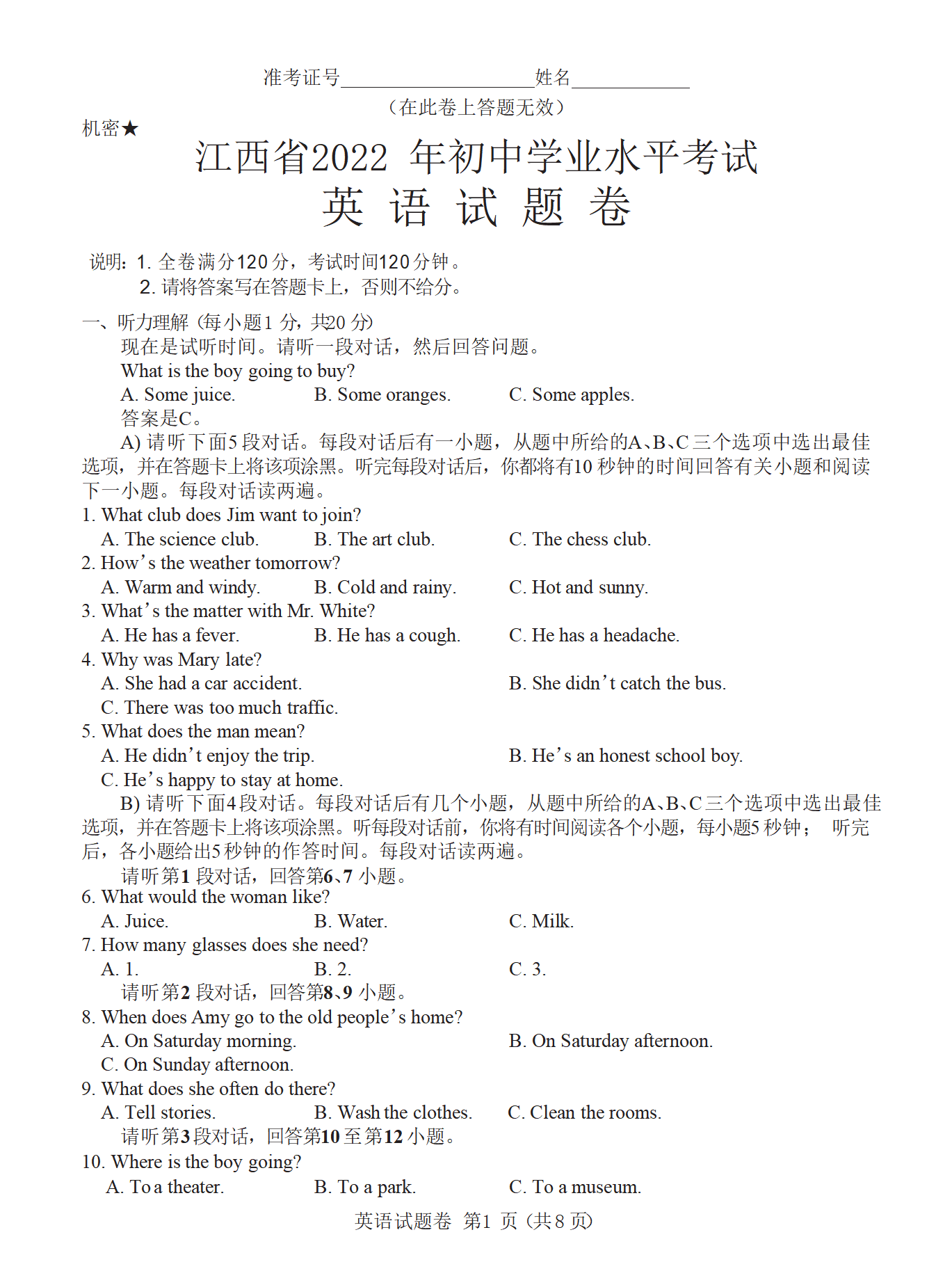 学生在初三年级将面临初级中学升学考试,即中考。中考的科目为语文、数学、英语、英语(含听力)、化学、政治、历史、生物、地理、体育。中考通常是每省统一试卷。下面是小编为大家收集的关于2022年江西省中考英语(含听力)试卷及答案。希望可以帮助大家。