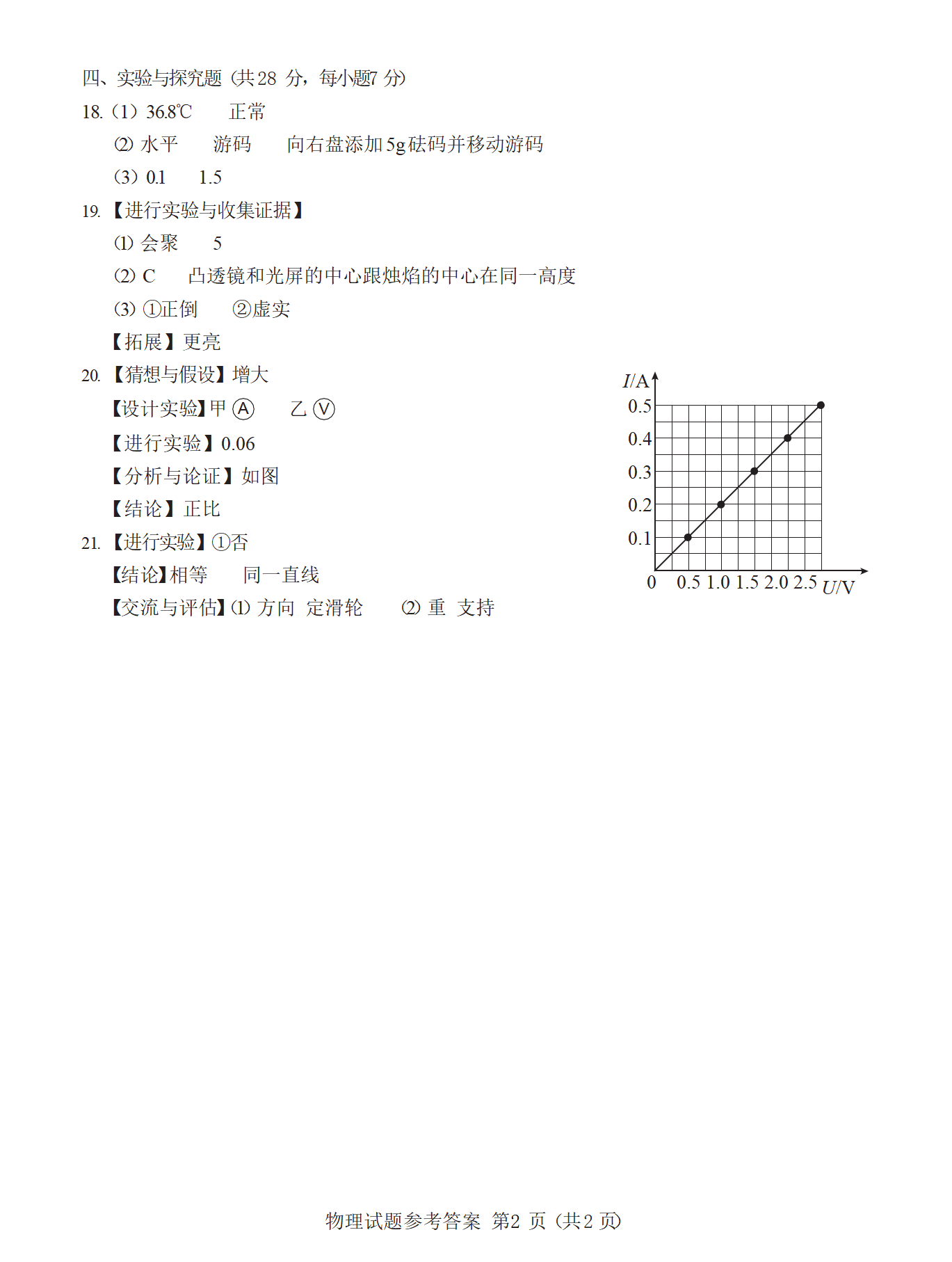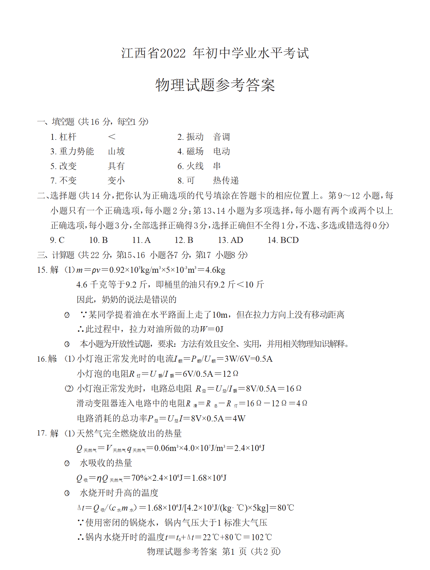 2022年江西省中考物理答案