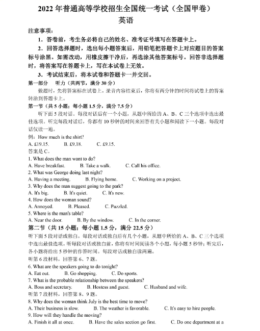 2022年高考全国甲卷英语试卷及详细答案