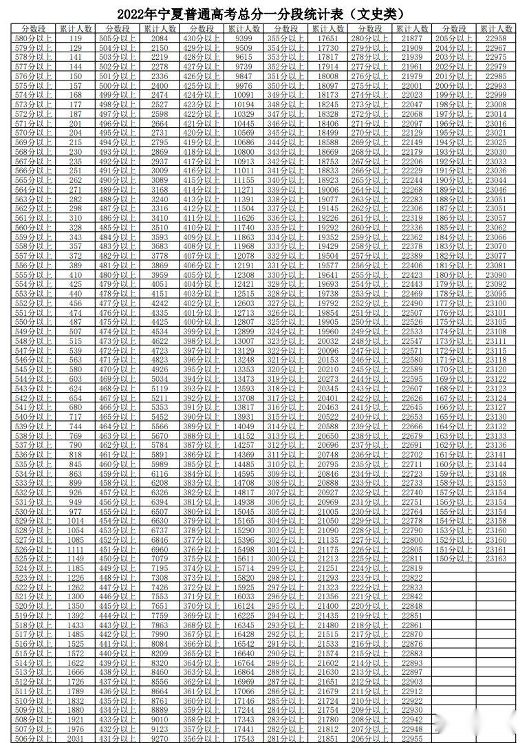 高考成绩分数段(一分一段表)是高考志愿填报的重要依据,也是各大高校划自己分数线的一部分依据。下面是小编整理的2022年宁夏一分一段表公布,欢迎大家阅读分享借鉴,希望对大家有所帮助。